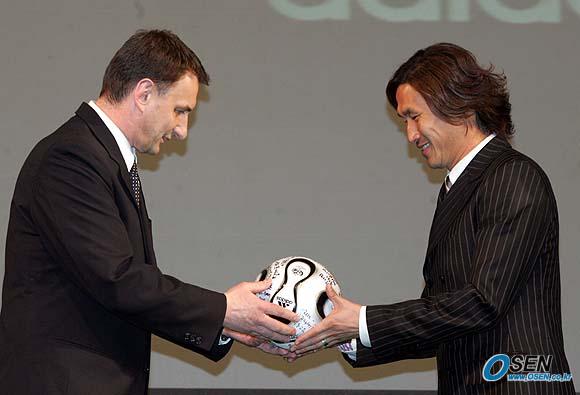 13일 저녁 서울 반포의 센트럴시티 밀레니엄 홀에서 아디다스사가 대한축구협회에 2006 독일월드컵 공인구 '팀 가이스트' 를 전달하는 이벤트가 열렸다. 울산 현대의 유상철이 벤트하이머 아디다스 코리아 사장으로부터 공인구 팀 가이스트를 받고 있다./손용호 기자 spjj@osen.co.kr [Copyright ⓒ 한국 최고의 스포츠 전문 미디어 OSEN(www.osen.co.kr) 무단전재 및 재배포 금지]