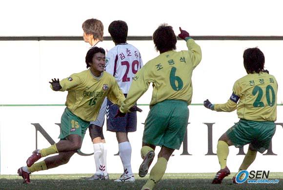 14일 서울 상암 월드컵경기장에서 벌어진 2005 하나은행 FA컵 4강전 전남 드래곤즈와 울산 현대미포조선의 경기 전반 현대미포조선의 이재천(15번)이 선제골을 넣은 뒤 기뻐하고 있다./상암=손용호 기자 spjj@osen.co.kr [Copyright ⓒ 한국 최고의 스포츠 전문 미디어 OSEN(www.osen.co.kr) 무단전재 및 재배포 금지]