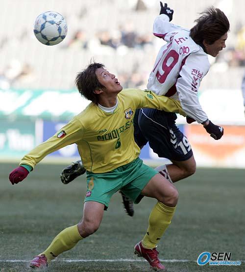 14일 서울 상암 월드컵경기장에서 벌어진 2005 하나은행 FA컵 4강전 전남 드래곤즈와 울산 현대미포조선의 경기 전반 현대미포조선의 조용석(왼쪽)이 전남 김도용을 제치고 공중볼을 따내고 있다./상암=손용호 기자 spjj@osen.co.kr [Copyright ⓒ 한국 최고의 스포츠 전문 미디어 OSEN(www.osen.co.kr) 무단전재 및 재배포 금지]