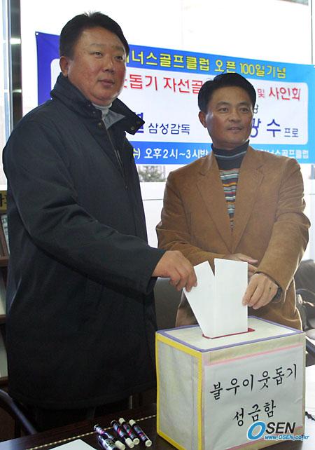선동렬 삼성 감독과 KPGA 2005시즌 상금왕 최광수 프로가 14일 오후 안양 위너스골프클럽에서 연말연시 불우이웃돕기 성금 모금을 위한 자선 골프클리닉 및 사인회를 개최했다. 선동렬 감독과 최광수 프로가 불우이웃돕기 성금을 모금함에 넣고 있다./안양=주지영 기자 jj0jj0@osen.co.kr [Copyright ⓒ 한국 최고의 스포츠 전문 미디어 OSEN(www.osen.co.kr) 무단전재 및 재배포 금지]