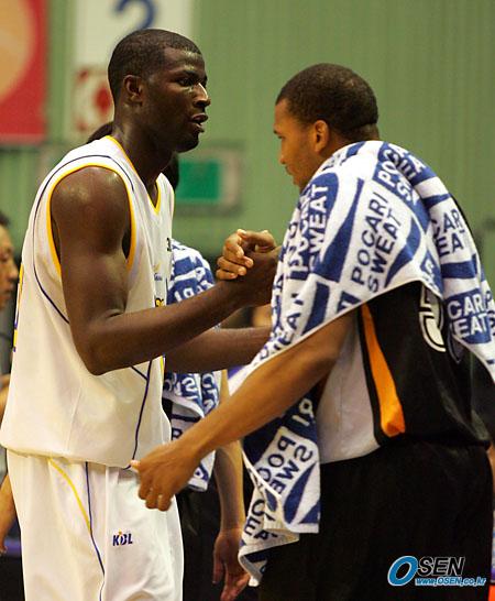 14일 잠실체육관에서 벌어진 2005~2006 KCC 프로농구 서울 삼성 썬더스와 인천 전자랜드 블랙슬래머의 경기서 104대 84로 삼성이 승리하며 4연승을 이어갔다.경기가 끝난뒤 오예데지와 온타리오 렛이 인사를 나누고 있다./잠실체=주지영 기자 jj0jj0@osen.co.kr [Copyright ⓒ 한국 최고의 스포츠 전문 미디어 OSEN(www.osen.co.kr) 무단전재 및 재배포 금지]