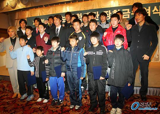 파이팅을 외치는 장학생들과 축구 스타들