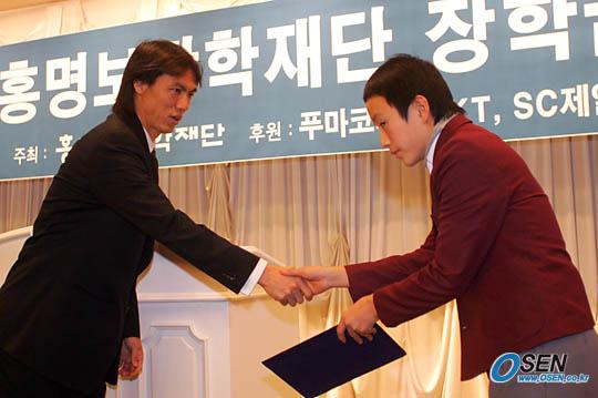 장학 증서를 전달하는 홍명보 코치
