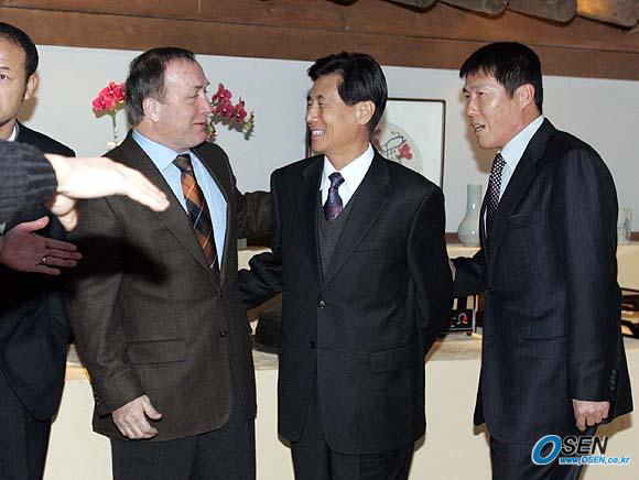 딕 아드보카트 국가대표팀 감독이 15일 서울 논현동 임페리얼 팰리스 호텔에서 프로축구 감독들을 초대, 오찬을 함께 했다. 아드보카트 감독과 김정남 울산 현대 감독이 밝은 표정으로 얘기를 나누고 있다./손용호 기자 spjj@osen.co.kr [Copyright ⓒ 한국 최고의 스포츠 전문 미디어 OSEN(www.osen.co.kr) 무단전재 및 재배포 금지]