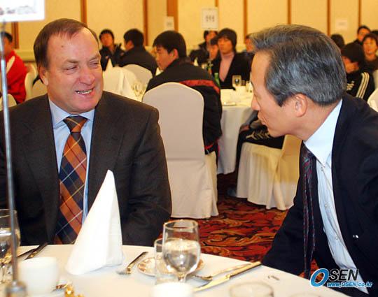딕 아드보카트 국가대표팀 감독이 15일 서울 논현동 임페리얼 팰리스 호텔에서 프로축구 감독들과 오찬을 함께 했다. 아드보카트 감독이 옆 자리에 앉은 정몽준 대한축구협회장과 이야기를 나누고 있다./주지영 기자 jj0jj0@osen.co.kr [Copyright ⓒ 한국 최고의 스포츠 전문 미디어 OSEN(www.osen.co.kr) 무단전재 및 재배포 금지]