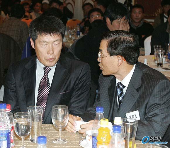 딕 아드보카트 국가대표팀 감독이 15일 서울 논현동 임피리얼 팰리스 호텔에서 대표선수들 전지훈련 차출과 관련, 협조를 구하기 위해 프로구단 감독들과 오찬을 함께 한 데 이어 2005 KFA 지도자 보수교육에서 특별 강연을 했다. 이영무 대한축구협회 신임 기술위원장(오른쪽)이 1년 선배인 차범근 수원 삼성 감독과 얘기를 나누고 있다./손용호 기자 spjj@osen.co.kr [Copyright ⓒ 한국 최고의 스포츠 전문 미디어 OSEN(www.osen.co.kr) 무단전재 및 재배포 금지]