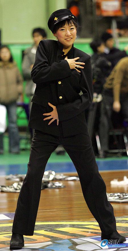 15일 잠실학생체육관에서 벌어진 2005~2006 KCC 프로농구 서울 SK 나이츠와 부산 KTF 매직윙스의 경기에 앞서 치어리더가 옛날 남학생 교복을 입고 춤을 추고 있다./잠실학생체=주지영 기자 jj0jj0@osen.co.kr [Copyright ⓒ 한국 최고의 스포츠 전문 미디어 OSEN(www.osen.co.kr) 무단전재 및 재배포 금지]