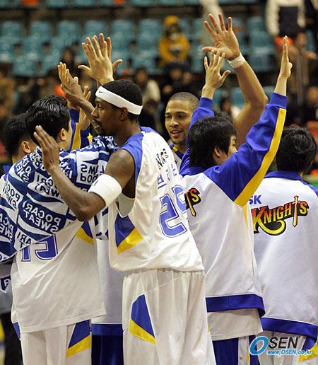 15일 잠실학생체육관에서 벌어진 2005~2006 KCC 프로농구 서울 SK 나이츠와 부산 KTF 매직윙스의 경기서 80-71로 이긴 SK 선수들이 하이파이브를 나누며 기뻐하고 있다./잠실학생체=주지영 기자 jj0jj0@osen.co.kr [Copyright ⓒ 한국 최고의 스포츠 전문 미디어 OSEN(www.osen.co.kr) 무단전재 및 재배포 금지]