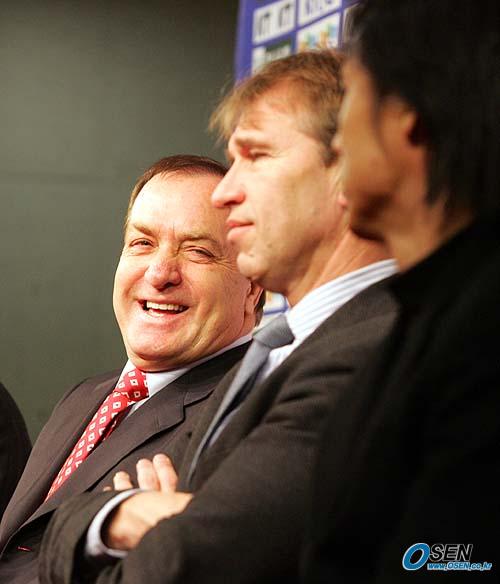 18일 유럽으로 떠나는 딕 아드보카트 국가대표팀 감독이 코칭스태프와 함께 17일 서울 상암 월드컵경기장에서 송년 기자회견을 가졌다. 회견 도중 아드보카트 감독이 베어벡, 홍명보 코치를 바라보며 웃고 있다./손용호 기자 spjj@osen.co.kr [Copyright ⓒ 한국 최고의 스포츠 전문 미디어 OSEN(www.osen.co.kr) 무단전재 및 재배포 금지]