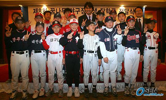 박찬호 장학재단이 17일 오후 서울 소공동 롯데호텔에서 제8회 꿈나무 야구 장학생 장학금 전달식을 가졌다. 박찬호가 장학금을 받은 어린이들과 기념 사진을 찍으며 손으로 V자를 만들어 보이고 있다./주지영 기자 jj0jj0@osen.co.kr [Copyright ⓒ 한국 최고의 스포츠 전문 미디어 OSEN(www.osen.co.kr) 무단전재 및 재배포 금지]
