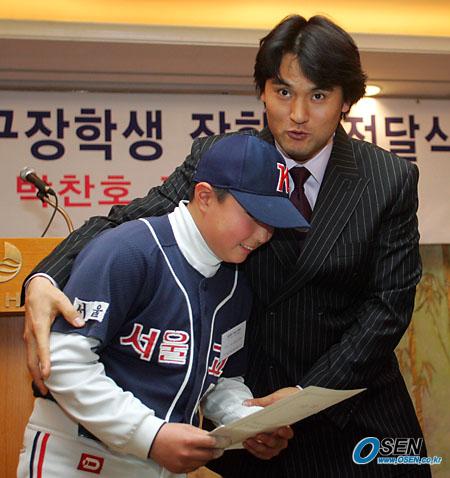 박찬호 장학재단이 17일 오후 서울 소공동 롯데호텔에서 제8회 꿈나무 야구 장학생 장학금 전달식을 가졌다. 박찬호가 장학증서를 받은 어린이에게 카메라를 보며 포즈를 취하라고 말하고 있다./주지영 기자 jj0jj0@osen.co.kr [Copyright ⓒ 한국 최고의 스포츠 전문 미디어 OSEN(www.osen.co.kr) 무단전재 및 재배포 금지]