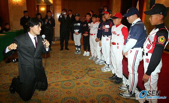박찬호 장학재단이 17일 오후 서울 소공동 롯데호텔에서 제8회 꿈나무 야구 장학생 장학금 전달식을 가졌다. 질문을 받는 순서에서 박찬호가 투수로 활약하고 있는 어린이들을 앞으로 불러내 포즈를 취해가며 훈련 방법을 설명하고 있다./주지영 기자 jj0jj0@osen.co.kr [Copyright ⓒ 한국 최고의 스포츠 전문 미디어 OSEN(www.osen.co.kr) 무단전재 및 재배포 금지]