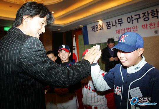 박찬호 장학재단이 17일 오후 서울 소공동 롯데호텔에서 제8회 꿈나무 야구 장학생 장학금 전달식을 가졌다. 박찬호가 꿈나무 어린이와 하이파이브를 나누고 있다./주지영 기자 jj0jj0@osen.co.kr [Copyright ⓒ 한국 최고의 스포츠 전문 미디어 OSEN(www.osen.co.kr) 무단전재 및 재배포 금지]