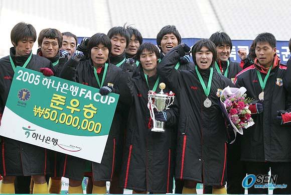 17일 서울 상암 월드컵경기장에서 벌어진 2005 하나은행 FA컵 결승전 전북 현대와 울산 현대미포조선의 경기서 전북이 전반에 터진 밀톤의 결승골로 1-0으로 이겨 우승컵을 차지했다. 돌풍을 일으키며 준우승을 차지한 현대미포조선 선수들이 준우승 트로피를 들고 좋아하고 있다./상암=손용호 기자 spjj@osen.co.kr [Copyright ⓒ 한국 최고의 스포츠 전문 미디어 OSEN(www.osen.co.kr) 무단전재 및 재배포 금지]