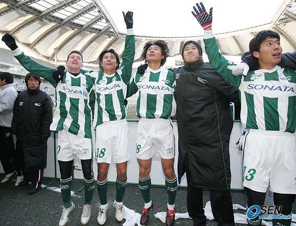 17일 서울 상암 월드컵경기장에서 벌어진 2005 하나은행 FA컵 결승전 전북 현대와 울산 현대미포조선의 경기서 전북이 전반에 터진 밀톤의 결승골로 1-0으로 이겨 우승컵을 차지했다. 전북 선수들이 우승을 확정지은 뒤 서포터스 앞으로 가 세리머니를 펼치고 있다./상암=손용호 기자 spjj@osen.co.kr [Copyright ⓒ 한국 최고의 스포츠 전문 미디어 OSEN(www.osen.co.kr) 무단전재 및 재배포 금지]