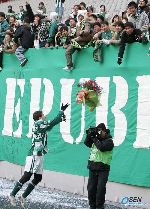 17일 서울 상암 월드컵경기장에서 벌어진 2005 하나은행 FA컵 결승전 전북 현대와 울산 현대미포조선의 경기서 전북이 전반에 터진 밀톤의 결승골로 1-0으로 이겨 우승컵을 차지했다. 보띠가 서포터스에게 우승 축하 꽃다발을 던져주고 있다./상암=손용호 기자 spjj@osen.co.kr [Copyright ⓒ 한국 최고의 스포츠 전문 미디어 OSEN(www.osen.co.kr) 무단전재 및 재배포 금지]