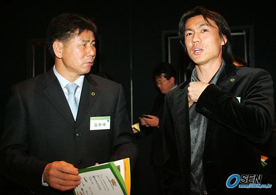 홍명보 장학재단 주최로 18일 수원 월드컵경기장에서 벌어지는 2005 푸마 자선축구 전야제가 17일 저녁 서울 하얏트 호텔에서 열렸다. 홍명보가 김현태 부천 SK 코치와 얘기를 나누고 있다./주지영 기자 jj0jj0@osen.co.kr [Copyright ⓒ 한국 최고의 스포츠 전문 미디어 OSEN(www.osen.co.kr) 무단전재 및 재배포 금지]