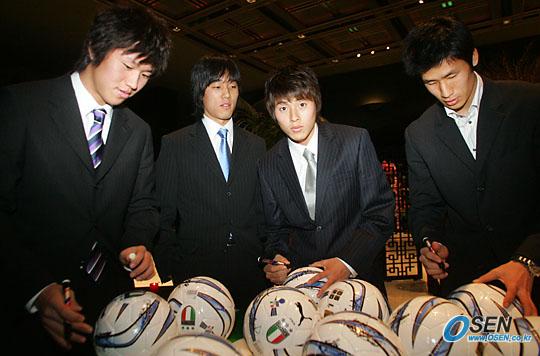 홍명보 장학재단 주최로 18일 수원 월드컵경기장에서 벌어지는 2005 푸마 자선축구 전야제가 17일 저녁 서울 하얏트 호텔에서 열렸다. 이호 박주영 백지훈 정조국(왼쪽으로부터)이 나란히 서서 축구공에 사인하고 있다./주지영 기자 jj0jj0@osen.co.kr [Copyright ⓒ 한국 최고의 스포츠 전문 미디어 OSEN(www.osen.co.kr) 무단전재 및 재배포 금지]