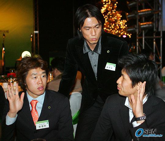 홍명보 장학재단 주최로 18일 수원 월드컵경기장에서 벌어지는 2005 푸마 자선축구 전야제가 17일 저녁 서울 하얏트 호텔에서 열렸다. 홍명보가 현영민(왼쪽)과 정조국이 앉아 있는 테이블에 다가가 얘기하고 있다./주지영 기자 jj0jj0@osen.co.kr [Copyright ⓒ 한국 최고의 스포츠 전문 미디어 OSEN(www.osen.co.kr) 무단전재 및 재배포 금지]