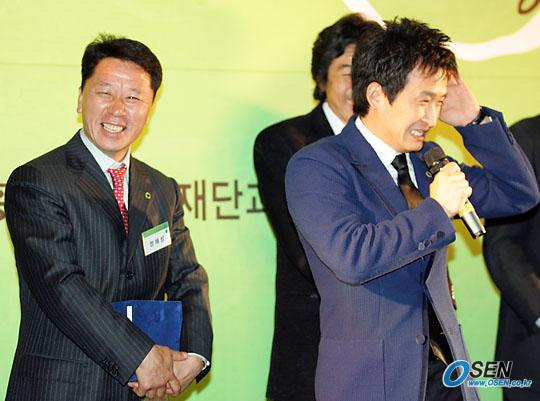홍명보 장학재단 주최로 18일 수원 월드컵경기장에서 벌어지는 2005 푸마 자선축구 전야제가 17일 저녁 서울 하얏트 호텔에서 열렸다. 감사패를 받은 정해성 부천 SK 감독(왼쪽)에게 작년과 비교해 소감을 말해 달라고 하자 "올해 처음 참가했다"는 답변에 서경석이 머리를 만지며 머쓱하게 웃고 있다./주지영 기자 jj0jj0@osen.co.kr [Copyright ⓒ 한국 최고의 스포츠 전문 미디어 OSEN(www.osen.co.kr) 무단전재 및 재배포 금지]
