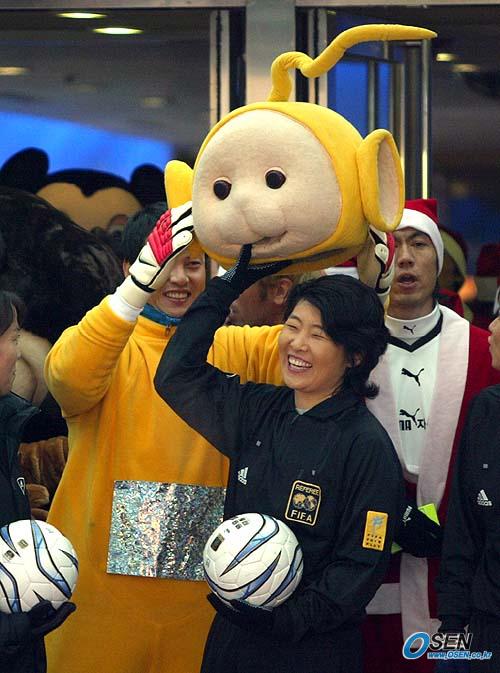 홍명보 장학재단이 주최하는 2005 푸마 자선축구 경기가 18일 오후 수원 월드컵경기장에서 열렸다. 이운재가 경기에 앞서 임은주 주심에게 '텔레토비'의 '나나' 차림으로 나가라고 장난을 치고 있다./ 수원=손용호 기자spjj@osen.co.kr [Copyright ⓒ 한국 최고의 스포츠 전문 미디어 OSEN(www.osen.co.kr) 무단전재 및 재배포 금지]