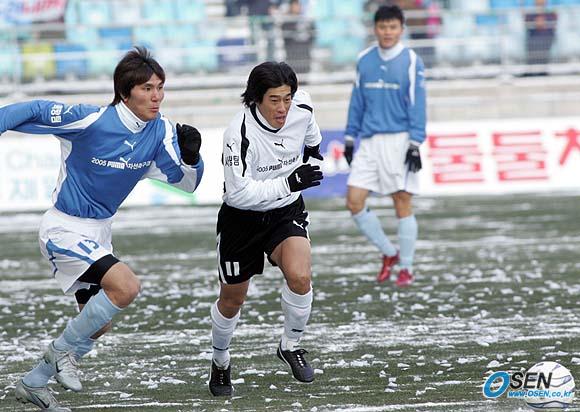 홍명보 장학재단이 주최하는 2005 푸마 자선축구 경기가 전 국가대표 중심의 사랑팀(흰색 상의)과 현 대표 위주의 희망팀(푸른색 상의)으로 나뉘어 18일 오후 수원 월드컵경기장에서 열렸다. 사랑팀의 서정원과 희망팀의 김동진이 볼을 따내기 위해 전력 질주하고 있다./ 수원=손용호 기자 spjj@osen.co.kr [Copyright ⓒ 한국 최고의 스포츠 전문 미디어 OSEN(www.osen.co.kr) 무단전재 및 재배포 금지]