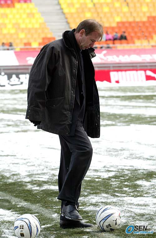 홍명보 장학재단이 주최하는 2005 푸마 자선축구 경기가 18일 오후 수원 월드컵경기장에서 열렸다. 2002년 월드컵 멤버들 중심의 사랑팀과 현 대표 선수 위주의 희망팀으로 나뉘어 벌인 경기에 앞서 희망팀의 사령탑을 맡은 베어벡 국가대표팀 수석코치가 눈 위에서 볼을 드리블해 보고 있다./ 수원=손용호 기자 spjj@osen.co.kr [Copyright ⓒ 한국 최고의 스포츠 전문 미디어 OSEN(www.osen.co.kr) 무단전재 및 재배포 금지]