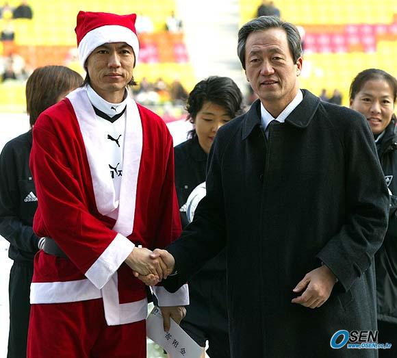 홍명보 장학재단이 주최하는 2005 푸마 자선축구 경기가 18일 오후 수원 월드컵경기장에서 열렸다. 2002년 월드컵 멤버들 중심의 사랑팀과 현 대표 선수 위주의 희망팀으로 나뉘어 벌인 경기에 앞서 정몽준 대한축구협회장이 홍명보에게 기부금을 전달하고 기념사진을 찍고 있다./ 수원=손용호 기자 spjj@osen.co.kr [Copyright ⓒ 한국 최고의 스포츠 전문 미디어 OSEN(www.osen.co.kr) 무단전재 및 재배포 금지]
