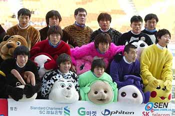 젊은 태극전사들이 '꼬꼬마 텔레토비'로 변신했다. 18일 수원 월드컵경기장에서 열린 홍명보 장학재단이 주관한 2005 푸마 자선축구경기. 그라운드 입장에 앞서 2002 한일월드컵 멤버 주축으로 산타 복장을 입은 '사랑팀'이 입장 터널에 들어섰다. 뒤이어 장내에 폭소가 터졌다. 현재 대표팀 멤버가 주축이 된 젊은 '희망팀'이 모습을 드러냈다. 다름 아닌 어린이들이 좋아하는 각종 캐릭터 복장을 입고 나타났기 때문이다. 이 가운데 '텔레토비'가 가장 눈길을 끌었다. '텔레토비'는 한 방송에서 인기 리에 방영됐던 어린이 프로그램으로 이날 '텔레토비'는 대표팀의 고참 이운재를 필두로 조원희(이상 수원) 백지훈(서울) 김영광(전남)이 맡았다. 이운재는 '희망팀'의 주장으로 '나나'(노란색) 캐릭터를 입고 선수들의 맨 앞에 섰다. 이어 '꽃미남' 백지훈은 '뚜비'(초록색), 김영광은 '뽀'(빨간색), 조원희는 '보라돌이'(보라색)를 입었다. 딕 아드보카트 감독의 신임을 듬뿍 받고 있는 조원희는 "미치겠어요"를 연발하면서 수줍어했다. 이어 "(김)영철이 형한테 밀려서 '보라돌이'를 입게 됐어요"라면서 멋쩍어 했다. 하지만 '보라돌이'를 면한 김영철(성남)도 그다지 기쁘지만은 않은 눈치. '다람쥐' 복장을 한 김영철은 앞에 서 있는 알 수 없는 캐릭터만을 응시했다. 이천수(울산)는 노란색의 '피카츄' 복장으로 그라운드에 나서 인사를 나눈 어린이들과 장난을 치면서 즐거운 시간을 보냈다. 수원=국영호 기자 iam905@osen.co.kr [Copyright ⓒ 한국 최고의 스포츠 전문 미디어 OSEN(www.osen.co.kr) 무단전재 및 재배포 금지]