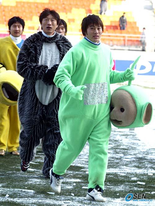 홍명보 장학재단이 주최하는 2005 푸마 자선축구 경기가 18일 오후 수원 월드컵경기장에서 열렸다. 2002년 월드컵 멤버들 중심의 사랑팀과 현 대표 선수 위주의 희망팀으로 나뉘어 벌인 경기에 앞서 희망팀의 백지훈이 '텔레토비'의 '뚜비' 복장으로 걸어오고 있다./ 수원=손용호 기자 spjj@osen.co.kr [Copyright ⓒ 한국 최고의 스포츠 전문 미디어 OSEN(www.osen.co.kr) 무단전재 및 재배포 금지]