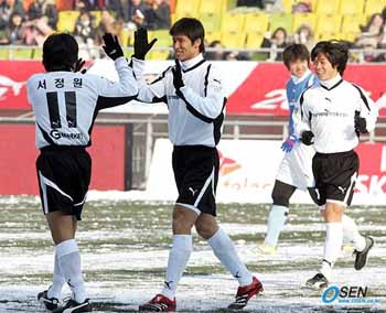 그라운드는 경기 전 내린 눈으로 하얗게 뒤덮여 쌀쌀한 분위기를 연출했지만 축구를 통한 사랑의 열기는 경기장을 뜨겁게 달구고도 남았다. 아드보카트호에서 주전 경쟁을 벌일 '육군 상병' 정경호(광주)는 해트트릭을 작성했고, 결혼을 앞둔 최성국(울산)은 '헹가래 세리머니'를 받았다. 오스트리아 무대에서 나이를 잊은 맹활약을 펼치고 있는 서정원(SV리트)도 오랜만에 밟은 고국 무대에서 골행진을 벌였다. 재단법인 홍명보장학재단이 18일 수원월드컵경기장에서 개최한 '2005 푸마 자선축구'에서 2002한일월드컵 멤버들이 주축이 된 사랑팀이 현 대표팀 멤버들이 주축을 이룬 희망팀을 6-5로 눌렀다. 내년 해외 전지훈련을 앞두고 32명 예비명단에 이름을 올린 사랑팀의 정조국(서울)은 선제골을 터뜨려 승부에 불을 지폈고 희망팀의 정경호(광주.3골)와 김두현(성남)은 연달아 골망을 갈라 분위기를 띄웠다. 이어 전반 34분 사랑팀의 최성국이 골을 터뜨리자 장내는 '결혼행진곡'이 울리면서 양팀 선수들은 일제히 최성국 주위로 몰려들어 헹가래를 쳐주면서 앞날의 행복을 기원하는 퍼포먼스를 펼쳤다. 사랑팀의 서정원은 3-5로 뒤지던 후반 15분 추가골과 20분 동점골 등 신기의 골행진을 벌여 경기장을 찾은 팬들의 뜨거운 갈채를 받았다. 또한 정경호는 전반 19분과 30분, 후반 9분 골퍼레이드 행진을 벌여 이날 가장 많은 골을 넣은 사나이가 됐고 덕분에 자선경기가 화려하게 빛냈다. 경기는 이날 출전 선수 가운데 유일한 대학생 신분인 여효진(고려대)이 후반 38분 문전으로 날아온 날카로운 프리킥을 헤딩골로 연결해 사랑팀이 한점차로 승리했다. 경기전 내린 눈과 체감 온도가 영하 20도까지 떨어져 관중들은 2000여 명이 찾는 데 그쳤지만 선수들은 아랑곳하지 않고 열띤 승부를 펼쳐 박수를 받았다. 선수들은 축구를 통한 사랑을 실천하기 위해 아낌없는 볼거리를 제공했다. 최성국과 현영민은 특유의 발재간을 선보였고 파울을 당할 때면 선수들은 다소 과정된 몸동작으로 웃음을 이끌어냈다. 사랑팀은 산타 클로스 복장으로 경기장에 입장했고 희망팀은 피카츄, 텔레토비 등 어린이들에게 친숙한 캐릭터 복장으로 그라운드에 나서 팬들에게 재미를 안겼다. 3골을 몰아친 희망팀의 정경호는 최우수선수(MVP)에 뽑혔고 가장 멋진 골을 터뜨린 선수에게 주어지는 '베스트 골'은 서정원에게 돌아갔다. 정경호는 "상무에서 체력훈련을 했는데 이런 결과가 나타난 것 같다"며 "MVP까지 받아 기분이 너무 좋다"고 환하게 웃었다. 수비수 3명을 제치고 멋진 골을 터뜨린 서정원은 "오스트리아에서와 같이 오늘도 경기도 경기가 잘 풀려 기분이 좋다"면서 어시스트를 건넨 후배들에게 공을 돌렸다. 수원=국영호 기자 iam905@osen.co.kr [Copyright ⓒ 한국 최고의 스포츠 전문 미디어 OSEN(www.osen.co.kr) 무단전재 및 재배포 금지]