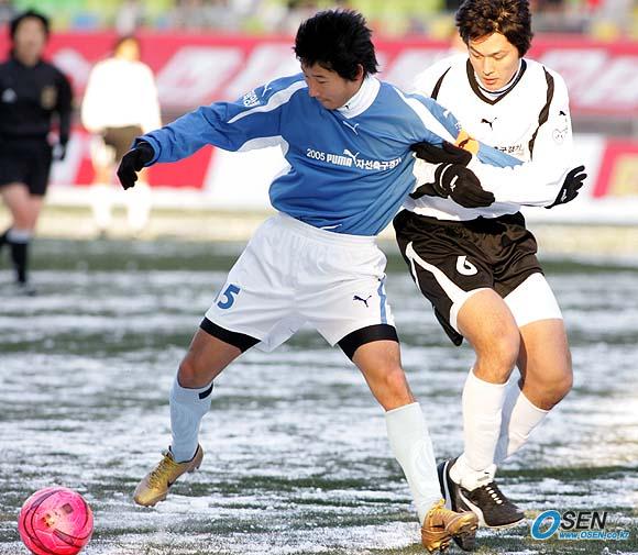 홍명보 장학재단이 주최하는 2005 푸마 자선축구 경기가 18일 오후 수원 월드컵경기장에서 열렸다. 2002년 월드컵 멤버들 중심의 사랑팀과 현 대표 선수 위주의 희망팀으로 나뉘어 벌인 경기는 사랑팀이 6-5로 승리를 거두었다. 희망팀 이천수(왼쪽)의 공격을 사랑팀 여효진이 팔을 붙잡으며 저지하고 있다./ 수원=손용호 기자 spjj@osen.co.kr [Copyright ⓒ 한국 최고의 스포츠 전문 미디어 OSEN(www.osen.co.kr) 무단전재 및 재배포 금지]