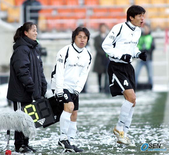 홍명보 장학재단이 주최하는 2005 푸마 자선축구 경기가 18일 오후 수원 월드컵경기장에서 열렸다. 2002년 월드컵 멤버들 중심의 사랑팀과 현 대표 선수 위주의 희망팀으로 나뉘어 벌인 경기는 사랑팀이 6-5로 승리를 거두었다. 사랑팀의 노정윤(왼쪽)과 최진철이 교체 멤버로 나오며 추운 표정을 짓고 있다./ 수원=손용호 기자 spjj@osen.co.kr [Copyright ⓒ 한국 최고의 스포츠 전문 미디어 OSEN(www.osen.co.kr) 무단전재 및 재배포 금지]