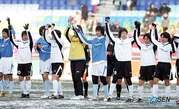 홍명보 장학재단이 주최하는 2005 푸마 자선축구 경기가 18일 오후 수원 월드컵경기장에서 열렸다. 2002년 월드컵 멤버들 중심의 사랑팀과 현 대표 선수 위주의 희망팀으로 나뉘어 벌인 경기는 사랑팀이 6-5로 승리를 거두었다. 경기가 끝나고 선수들이 팬에게 인사를 하고 있다./ 수원=손용호 기자 spjj@osen.co.kr [Copyright ⓒ 한국 최고의 스포츠 전문 미디어 OSEN(www.osen.co.kr) 무단전재 및 재배포 금지]