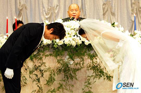 18일 포항 스틸러스의 이동국이 7년간 사귀었던 1997년 미스코리아 하와이 이수진씨와 센트럴시티 밀레니엄홀에서 백년가약을 맺었다. 결혼식은 이날 벌어진 2005 푸마자선축구대회를 마친 동료들도 참석 이들의 앞날을 축복해주었다.이동국이 신부 이수진씨와 맞 절을 하고있다./센트럴=주지영 기자 jj0jj0@osen.co.kr [Copyright ⓒ 한국 최고의 스포츠 전문 미디어 OSEN(www.osen.co.kr) 무단전재 및 재배포 금지]