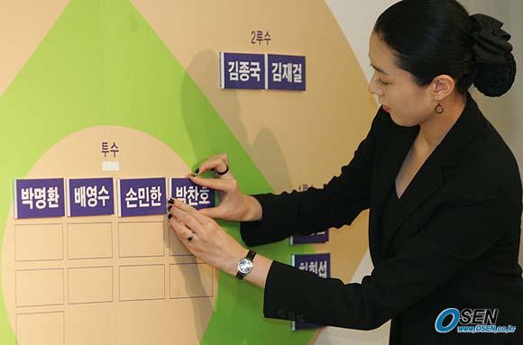 김인식 WBC(월드베이스볼클래식) 대표팀 감독이 20일 오후 서울 청담동 프리마호텔에서 29명의 최종 엔트리를 발표했다. 도우미가 박찬호의 이름표를 보드에 붙이고 있다. 박찬호는 98년 방콕 아시안게임 이후 7년만에 태극 마크를 달게 됐다./손용호 기자 spjj@osen.co.kr [Copyright ⓒ 한국 최고의 스포츠 전문 미디어 OSEN(www.osen.co.kr) 무단전재 및 재배포 금지]