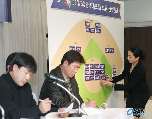 김인식 WBC(월드베이스볼클래식) 대표팀 감독이 20일 오후 서울 청담동 프리마호텔에서 29명의 최종 엔트리를 발표했다. 김재박 대표팀 코치가 구대성을 마지막으로 호명하자 도우미가 보드에 이름표를 붙이고 있다./손용호 기자 spjj@osen.co.kr [Copyright ⓒ 한국 최고의 스포츠 전문 미디어 OSEN(www.osen.co.kr) 무단전재 및 재배포 금지]