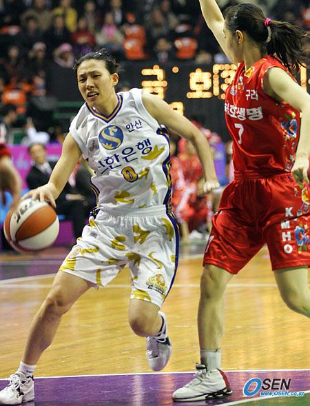 2006 금호아시아나배 여자 프로농구 겨울리그가 20일 장충체육관에서 신한은행과 금호생명의 개막전으로 시작됐다. 신한은행의 전주원(왼쪽)이 김경희를 피하며 드리블하고 있다./장충체=주지영 기자 jj0jj0@osen.co.kr [Copyright ⓒ 한국 최고의 스포츠 전문 미디어 OSEN(www.osen.co.kr) 무단전재 및 재배포 금지]