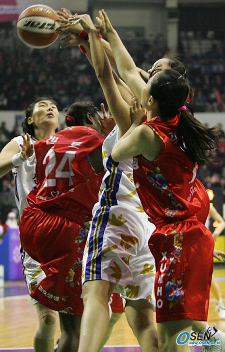 2006 금호아시아나배 여자 프로농구 겨울리그가 20일 장충체육관에서 신한은행과 금호생명의 개막전으로 시작됐다. 신한은행의 강지숙(흰 유니폼)이 겐트와 김경희 등에 끼어 리바운드한 공을 놓치고 있다./장충체=주지영 기자 jj0jj0@osen.co.kr [Copyright ⓒ 한국 최고의 스포츠 전문 미디어 OSEN(www.osen.co.kr) 무단전재 및 재배포 금지]