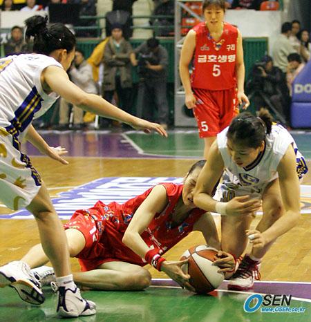 2006 금호아시아나배 여자 프로농구 겨울리그가 20일 장충체육관에서 신한은행과 금호생명의 개막전으로 시작됐다. 금호생명의 이종애가 신한은행 진미정과 넘어지면서도 서로 공을 차지하기 위해 몸을 날리고 있다./장충체=주지영 기자 jj0jj0@osen.co.kr [Copyright ⓒ 한국 최고의 스포츠 전문 미디어 OSEN(www.osen.co.kr) 무단전재 및 재배포 금지]