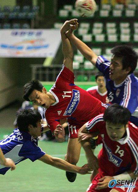지난 20일 개막된 2005-2006 대한항공배 핸드볼 큰잔치 남자 대학부 1차대회 이틀째 경기가 21일 잠실학생 체육관에세 열렸다. 조선대의 임효섭(가운데)이 점프슛을 시도했으나 원광대의 김동명(오른쪽)의 마크에 걸리고 있다. 조선대가 38-35로 승리했다./잠실학생체=주지영 기자 jj0jj0@osen.co.kr [Copyright ⓒ 한국 최고의 스포츠 전문 미디어 OSEN(www.osen.co.kr) 무단전재 및 재배포 금지]