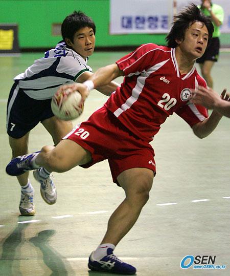 지난 20일 개막된 2005-2006 대한항공배 핸드볼 큰잔치 남자 대학부 1차대회 이틀째 경기가 21일 잠실학생 체육관에서 열렸다. 한체대의 심재복이 삼척대의 김동하를 제치고 슈팅 동작에 들어가고 있다. 한체대가 31-29로 승리, 2연승을 거뒀다./잠실학생체=주지영 기자 jj0jj0@osen.co.kr [Copyright ⓒ 한국 최고의 스포츠 전문 미디어 OSEN(www.osen.co.kr) 무단전재 및 재배포 금지]