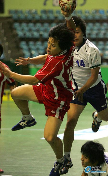 지난 20일 개막된 2005-2006 대한항공배 핸드볼 큰잔치 남자 대학부 1차대회 이틀째 경기가 21일 잠실학생 체육관에서 열렸다. 한체대의 심재복이 포스트플레이로 김경민(오른쪽에서 두 번째) 등 삼척대 수비진을 따돌리고 중앙을 돌파하며 슛을 시도하고 있다. 한체대가 31-29로 승리, 2연승을 거뒀다./잠실학생체=주지영 기자 jj0jj0@osen.co.kr [Copyright ⓒ 한국 최고의 스포츠 전문 미디어 OSEN(www.osen.co.kr) 무단전재 및 재배포 금지]