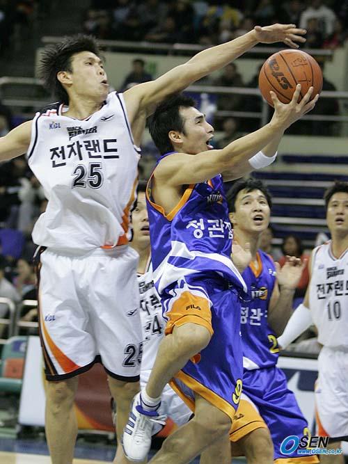 21일 부천체육관에서 벌어진 2005~2006 KCC 프로농구 인천 전자랜드와 안양 KT&G의 경기 2쿼터서 KT&G의 주희정이 전자랜드 김택훈의 블로킹이 미치기 전에 잽싸게 레이업슛을 성공시키고 있다./부천=손용호 기자spjj@osen.co.kr [Copyright ⓒ 한국 최고의 스포츠 전문 미디어 OSEN(www.osen.co.kr) 무단전재 및 재배포 금지]