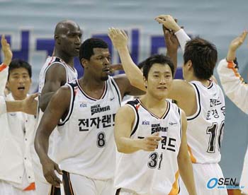 인천 전자랜드가 올 시즌 들어 처음으로 연승을 기록했고 부산 KTF는 4연패 수렁에 빠졌다. 전자랜드는 21일 부천 실내체육관에서 열린 2005~2006 KCC 프로농구 정규리그 홈경기에서 용병 리 벤슨(29득점, 17리바운드)와 3점슛 5개를 터뜨린 문경은(24득점), 앨버트 화이트(14득점, 8리바운드)의 활약으로 단테 존스(30득점, 3점슛 4개, 8리바운드), 김성철(15득점, 3점슛 3개, 7어시스트), 허브 래미자냐(16득점, 12리바운드)가 분전한 안양 KT&G를 86-81로 제압했다. 이로써 전자랜드는 2연승을 기록하며 올시즌 들어 첫 연승행진을 달렸고 홈경기 7연패 사슬도 끊었다. 승부는 막판에 갈렸다. 80-80이던 종료 2분 20초전 문경은의 2점슛으로 82-80으로 앞서나간 전자랜드는 KT&G의 공격을 철저하게 차단하며 승기를 잡기 시작했다. 이어 벤슨과 화이트가 파울로 얻은 자유투 2개 중 1개씩을 침착하게 넣으며 점수차를 벌렸고 버저비터와 함께 나온 김택훈(9득점, 6리바운드, 4어시스트)의 2점슛으로 양희승(7득점)이 자유투 1개로 1점을 추가하는데 그친 KT&G를 물리칠 수 있었다. 한편 부산에서는 전주 KCC가 홈팀 KTF를 97-80으로 완파하고 단독 5위로 뛰어 올랐다. 이날 KCC는 찰스 민렌드가 3점슛 2개를 포함해 32득점을 넣었고 추승균도 3점슛 4개 포함해 20득점을 몰아치며 팀 승리를 견인했다. 반면 KTF는 애런 맥기가 부상투혼을 발휘하며 24득점으로 분전했지만 부상으로 출전하지 못한 슈터 조상현의 공백을 메우지 못하고 4연패에 빠졌다. 관심을 모았던 KCC 이상민(9득점, 5리바운드, 10어시스트, 3스틸)과 KTF 신기성(8득점, 2리바운드, 13어시스트, 5스틸)의 '최고 가드 대결'은 기록상으로는 무승부로 끝났다. ■ 21일 전적 ▲ 부천 인천 전자랜드 86 (24-17 22-30 19-18 21-16) 81 안양 KT&G ▲ 부산 부산 KTF 80 (23-29 24-24 20-25 13-19) 97 전주 KCC ■ 정규리그 중간 순위 (21일 현재) ① 원주 동부 15승 8패 (0.652) - ② 울산 모비스 14승 8패 (0.636) 0.5 ③ 서울 삼성 14승 9패 (0.609) 1.0 ④ 창원 LG 11승 10패 (0.524) 3.0 ⑤ 전주 KCC 12승 11패 (0.522) 3.0 ⑥ 대구 오리온스 11승 11패 (0.500) 3.5 ⑦ 서울 SK 11승 12패 (0.478) 4.0 ⑧ 안양 KT&G 10승 13패 (0.435) 5.0 ⑧ 부산 KTF 10승 13패 (0.435) 5.0 ⑩ 인천 전자랜드 5승 18패 (0.217) 10.0 부천=글, 박상현 기자 tankpark@osen.co.kr 사진, 손용호 기자 spjj@osen.co.kr [Copyright ⓒ 한국 최고의 스포츠 전문 미디어 OSEN(www.osen.co.kr) 무단전재 및 재배포 금지]