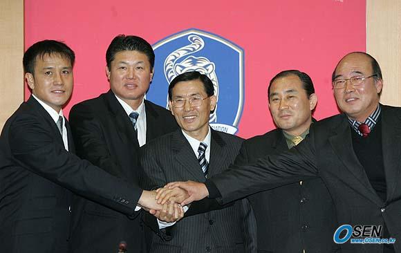 22일 오전 서울 신문로 축구회관에서 새로 구성된 대한축구협회 기술위원회 첫 모임이 열렸다. 새로이 선임된 김주성 최경식 신현호 이상엽(왼쪽으로부터) 위원이 이영무 위원장을 중심으로 손을 모으고 포즈를 취하고 있다./손용호 기자 spjj@osen.co.kr [Copyright ⓒ 한국 최고의 스포츠 전문 미디어 OSEN(www.osen.co.kr) 무단전재 및 재배포 금지]