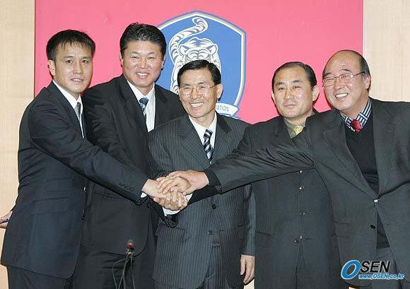 22일 오전 서울 신문로 축구회관에서 새로 구성된 대한축구협회 기술위원회 첫 모임이 열렸다. 새로이 선임된 김주성 최경식 이영무(위원장) 신현호 이상엽 위원(왼쪽으로부터)이 손을 모으고 파이팅을 다짐하고 있다./손용호 기자 spjj@osen.co.kr [Copyright ⓒ 한국 최고의 스포츠 전문 미디어 OSEN(www.osen.co.kr) 무단전재 및 재배포 금지]