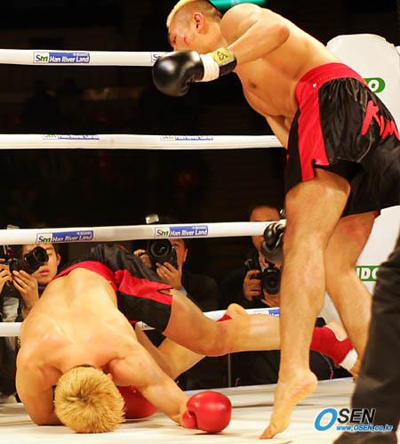 코마 헤비급 그랑프리 대회가 22일 서울 장충체육관에서 벌어졌다. 준결승에서 이면주가 니무라 유키에게 2라운드서 강타를 맞고 앞으로 거꾸러지고 있다. 니무라의 KO승./장충체=주지영 기자 jj0jj0@0sen.co.kr [Copyright ⓒ 한국 최고의 스포츠 전문 미디어 OSEN(www.osen.co.kr) 무단전재 및 재배포 금지]