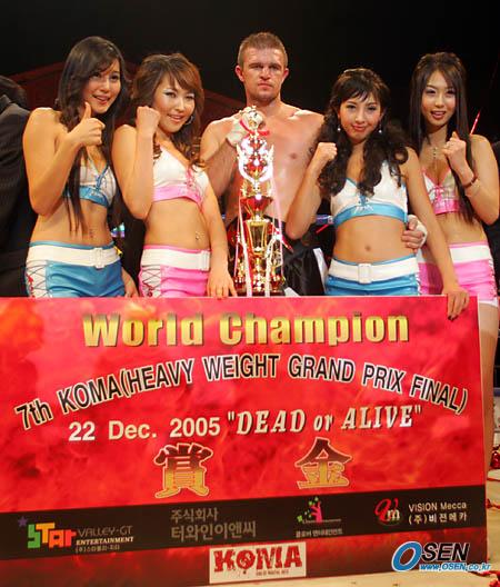 코마 헤비급 그랑프리 파이널 대회가 22일 서울 장충체육관에서 벌어졌다. 준결승서 이면주를 KO로 눕히고결승에 올라온 니무라 유키를 꺾고 챔피언에 오른 폴 '스팅' 슬로윈스키가 코마걸들과 포즈를 취하고 있다./장충체=주지영 기자 jj0jj0@0sen.co.kr [Copyright ⓒ 한국 최고의 스포츠 전문 미디어 OSEN(www.osen.co.kr) 무단전재 및 재배포 금지]