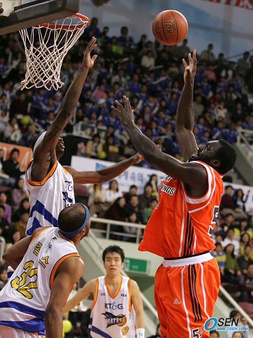 24일 안양체육관에서 벌어진 2005~2006 KCC 프로농구 안양 KT&G와 부산 KTF의 경기 4쿼터서 KTF의 나이젤 딕슨이 KT&G 허브 래미쟈나(왼쪽) 앞에서 훅슛을 던지고 있다. 래미쟈나가 점프하며 볼을 쳐냈지만 심판이 골로 판정했다. /안양=손용호 기자 spjj@osen.co.kr [Copyright ⓒ 한국 최고의 스포츠 전문 미디어 OSEN(www.osen.co.kr) 무단전재 및 재배포 금지]